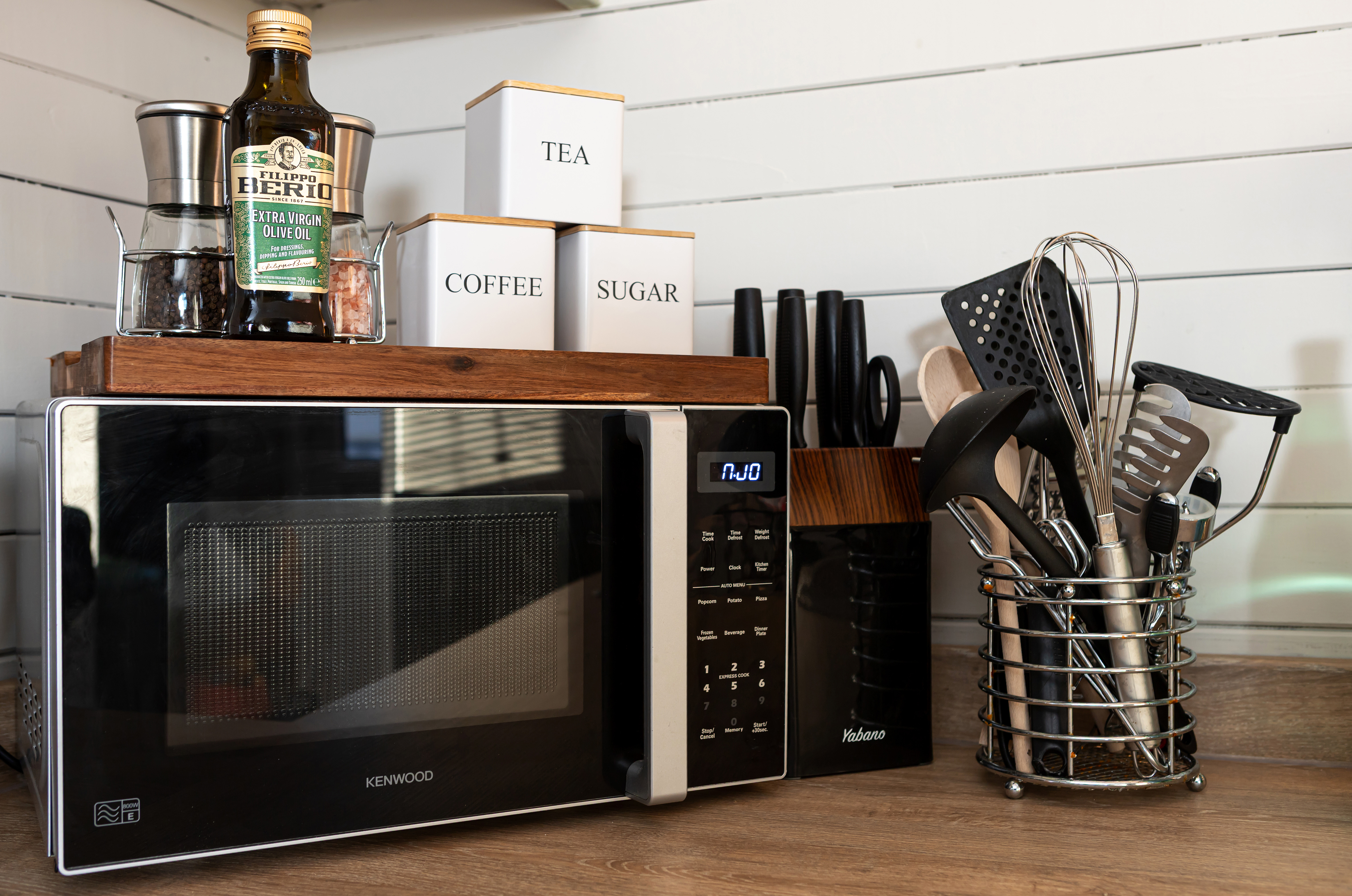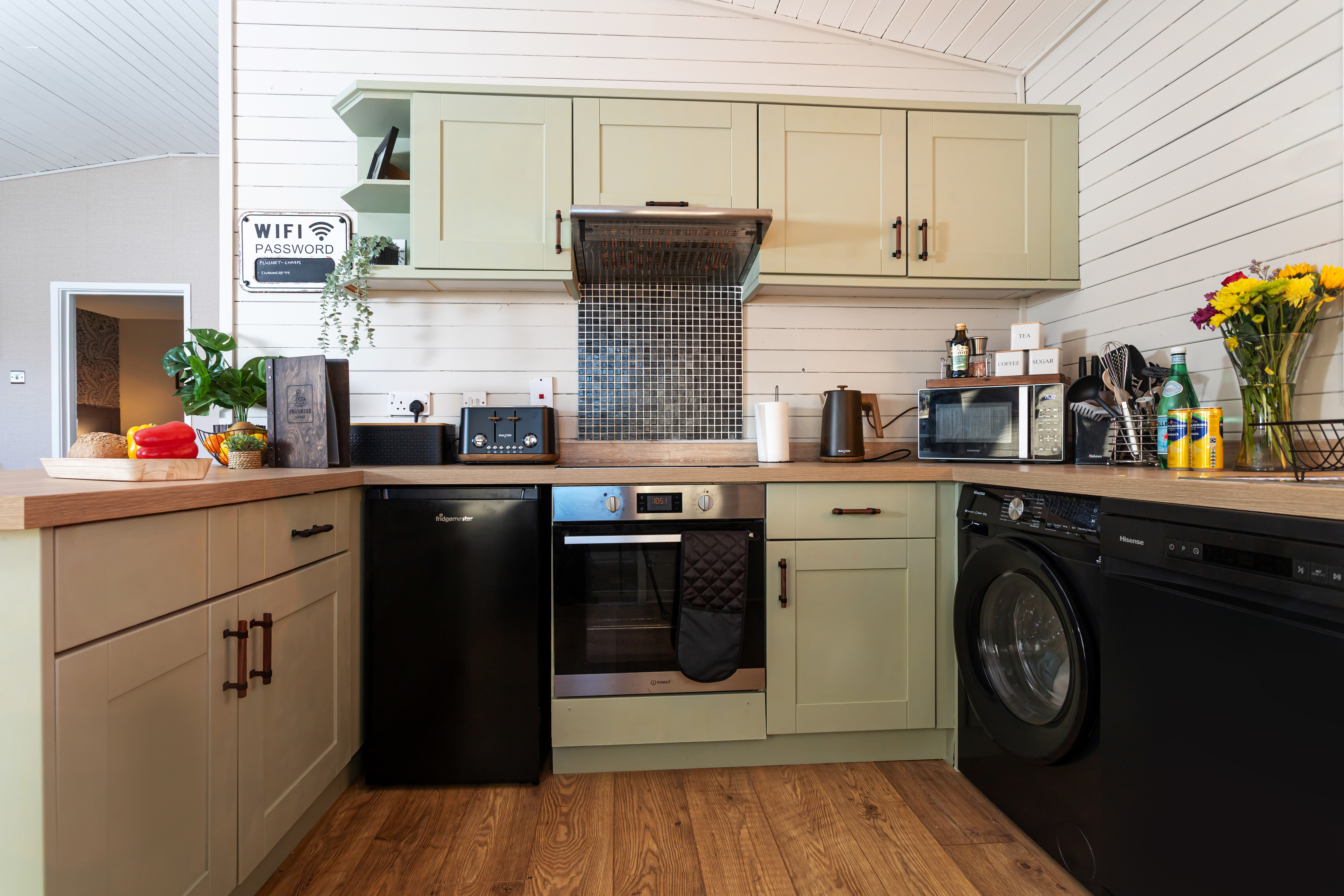 Open plan modern kitchen with breakfast bar, including 2 seats and all the home comforts you would expect, fridge freezer, dishwasher, washer/dryer, oven and hob, kettle, toaster, air fryer and microwave.