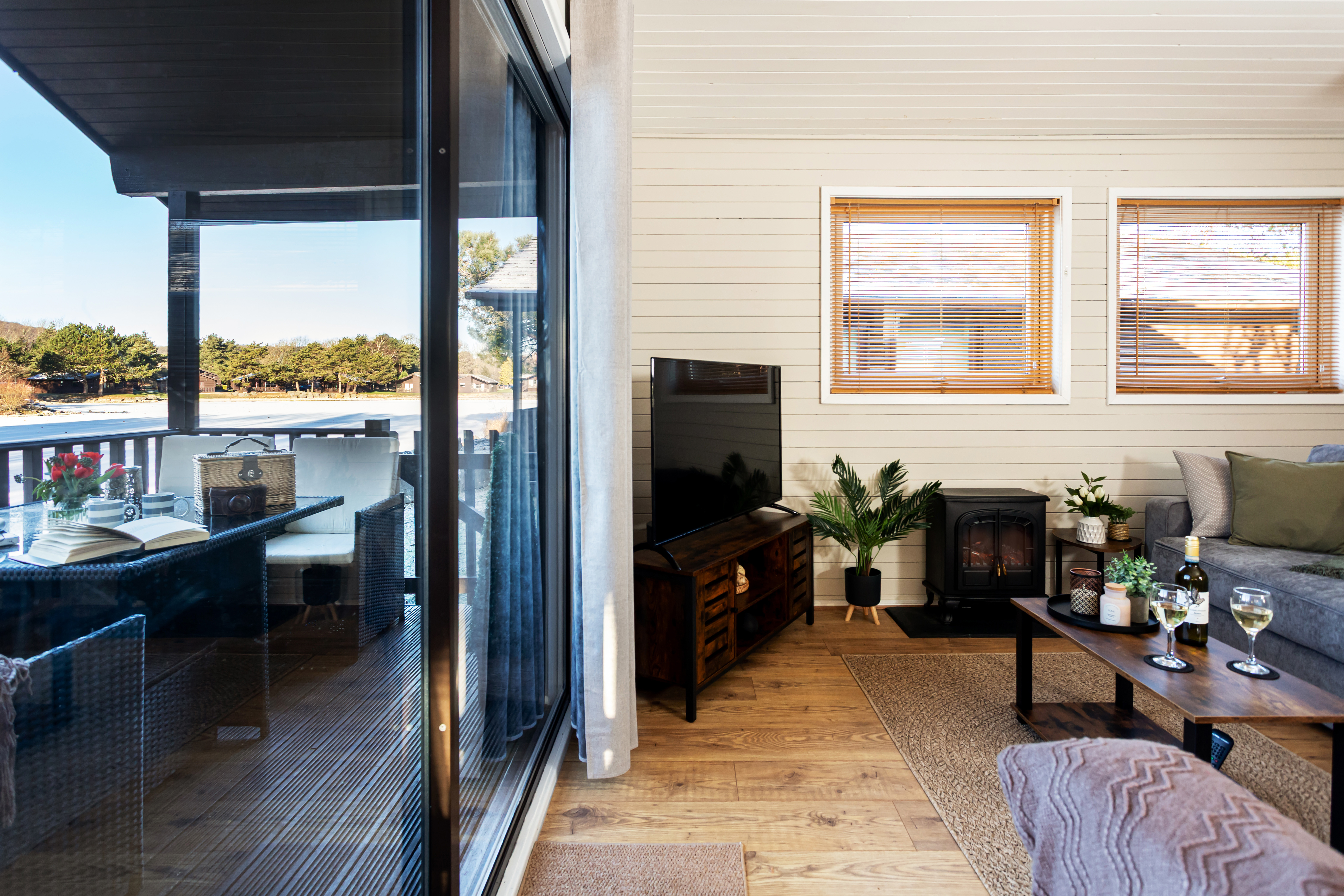 The lounge/living area is a comfy cosy room with 2 comfortable sofas, one of which doubles as a sofa bed to sleep 2 where you can sit and relax to take in the view of lake.