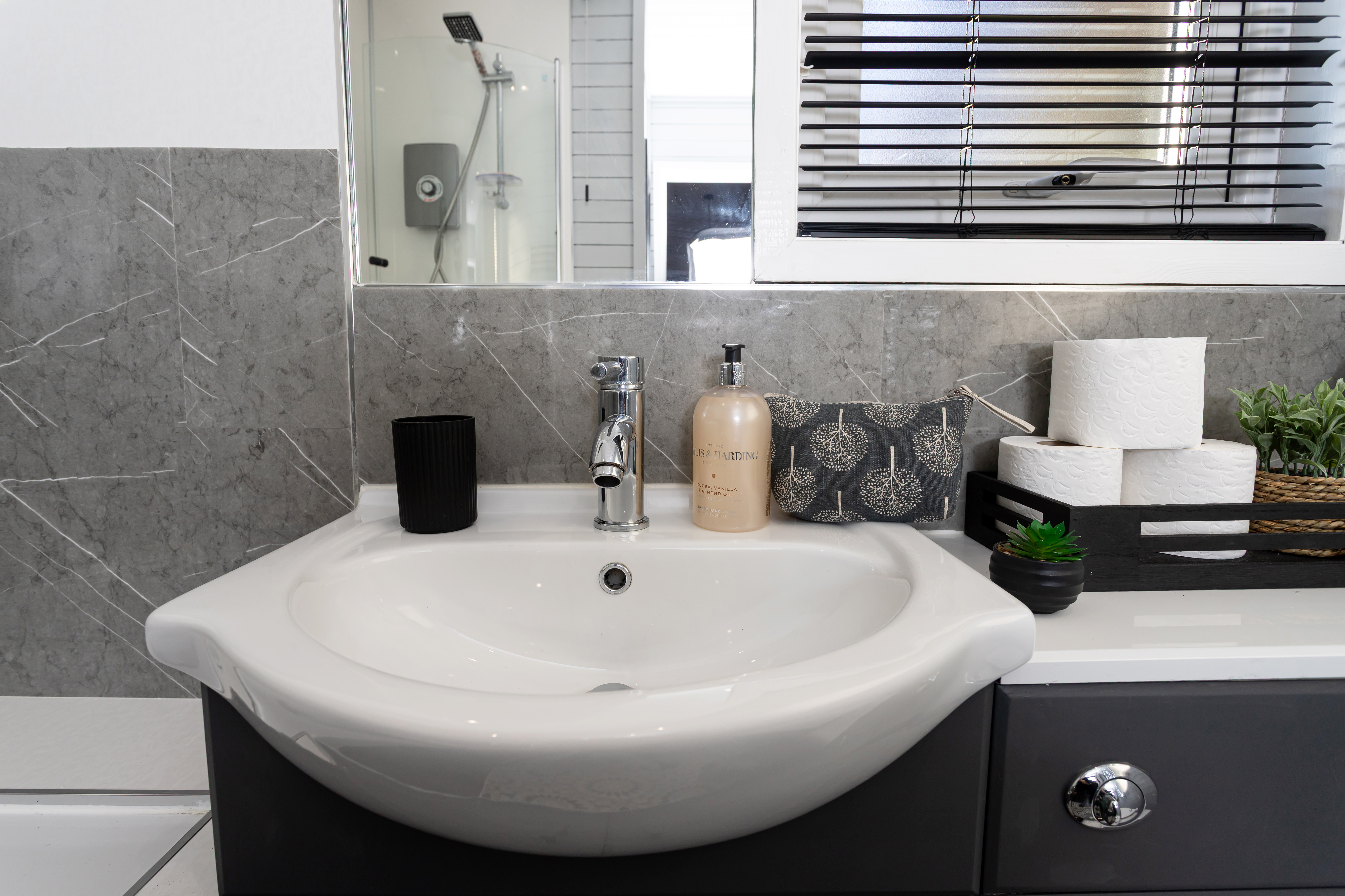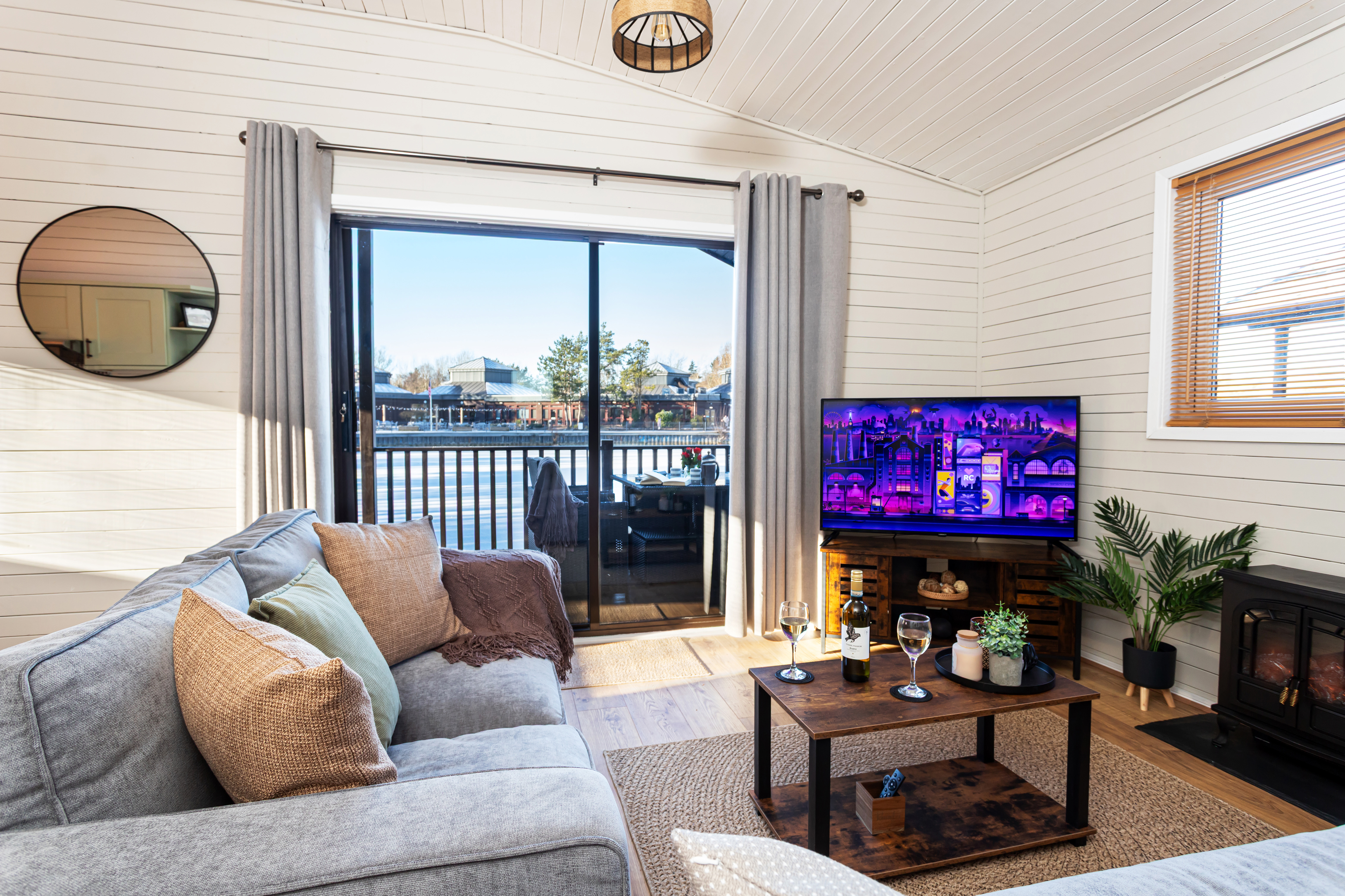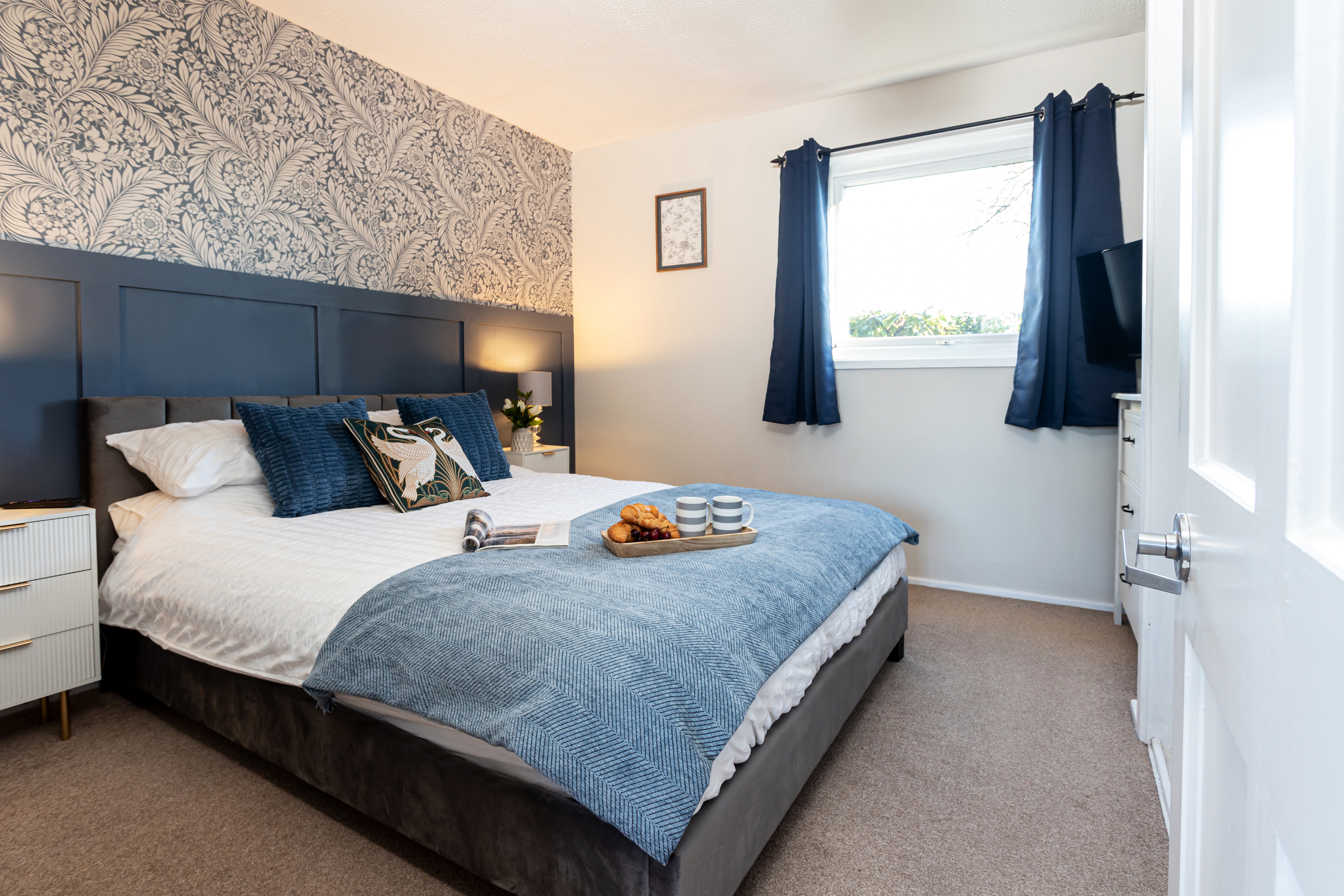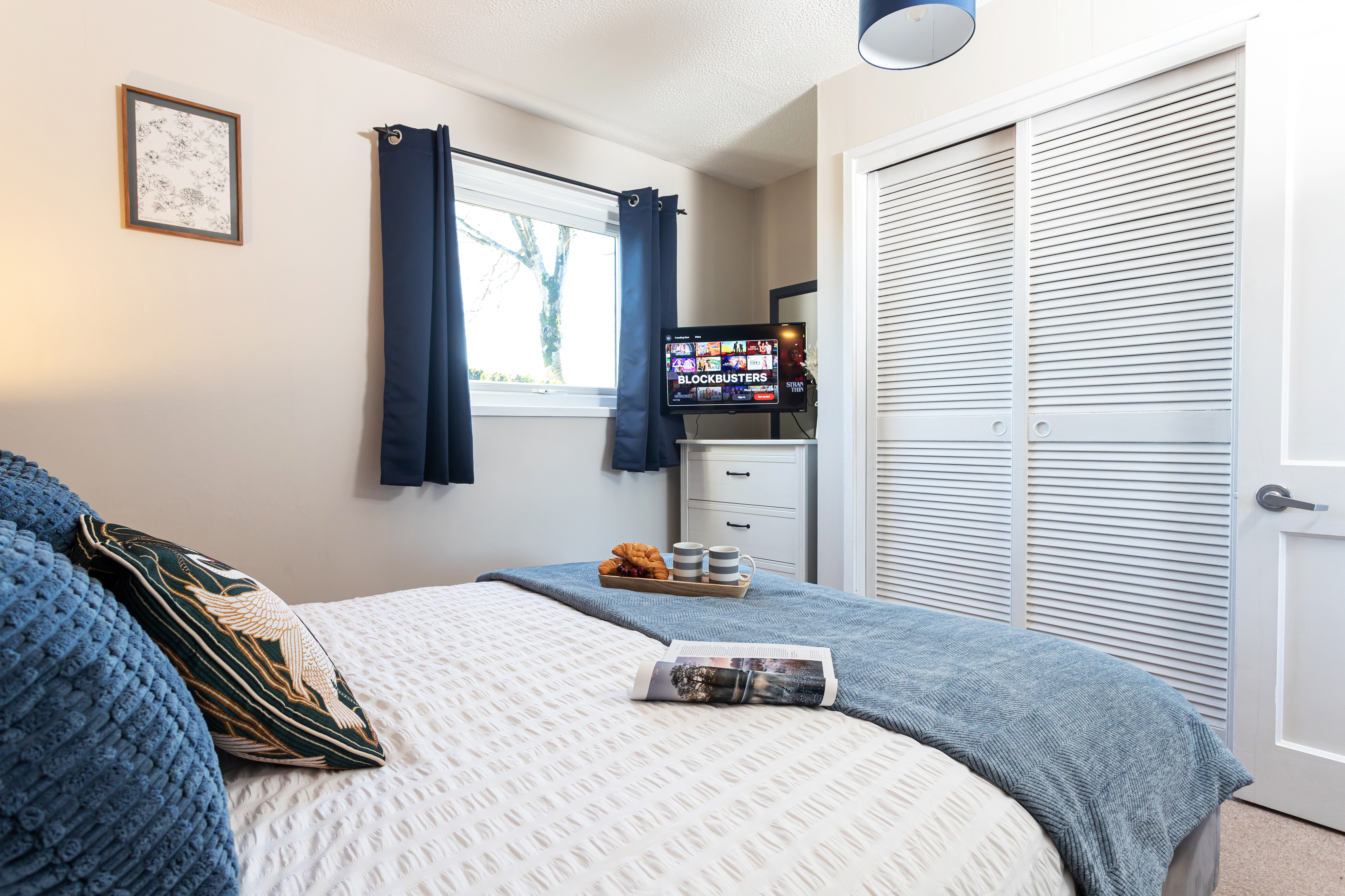The main bedroom has a king-size bed with a comfortable luxury mattress, fitted wardrobes which provide plenty of storage, blackout curtains, a wall mounted 32" smart TV and Alexa controlled WiFi electric heaters.