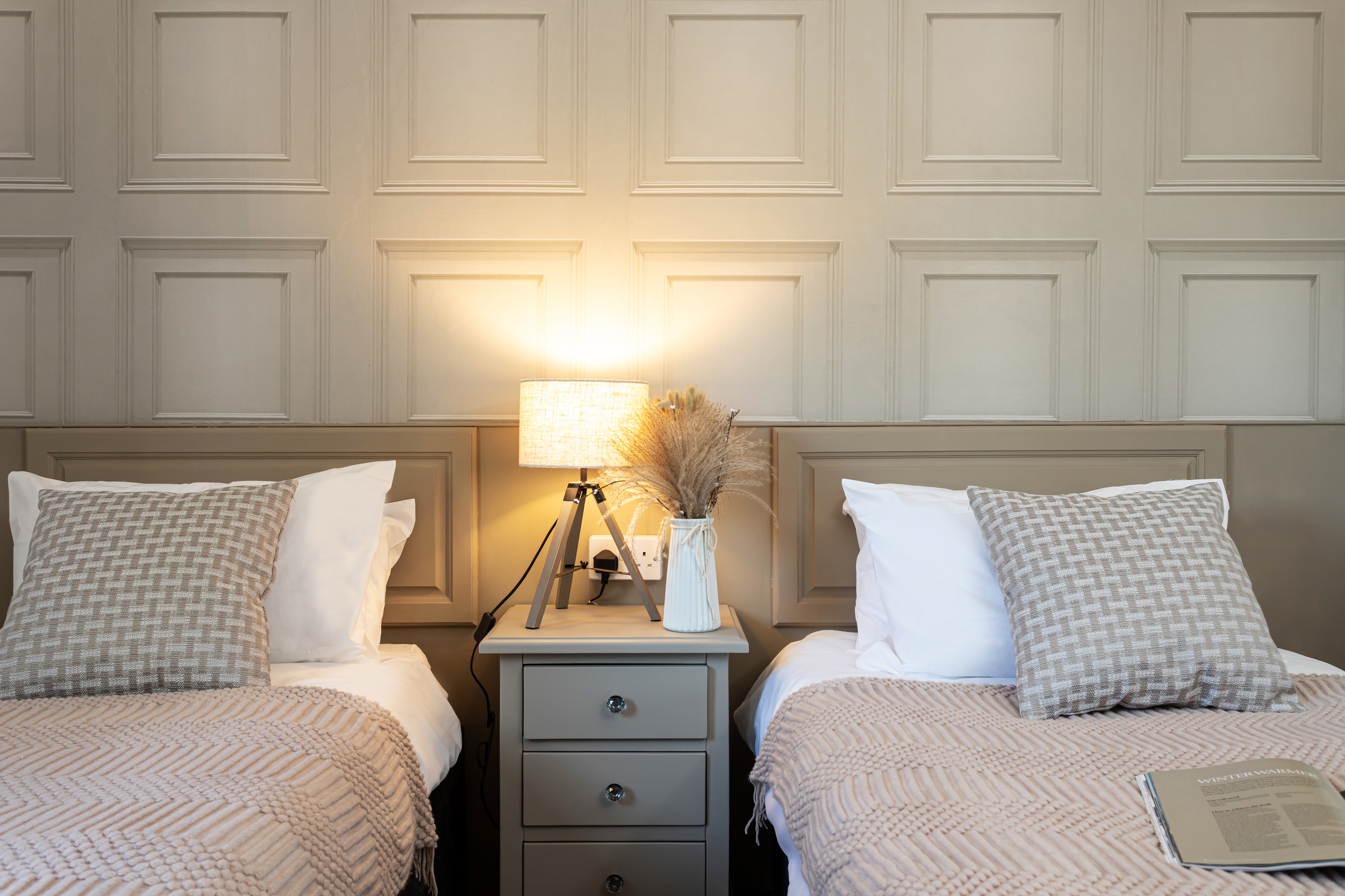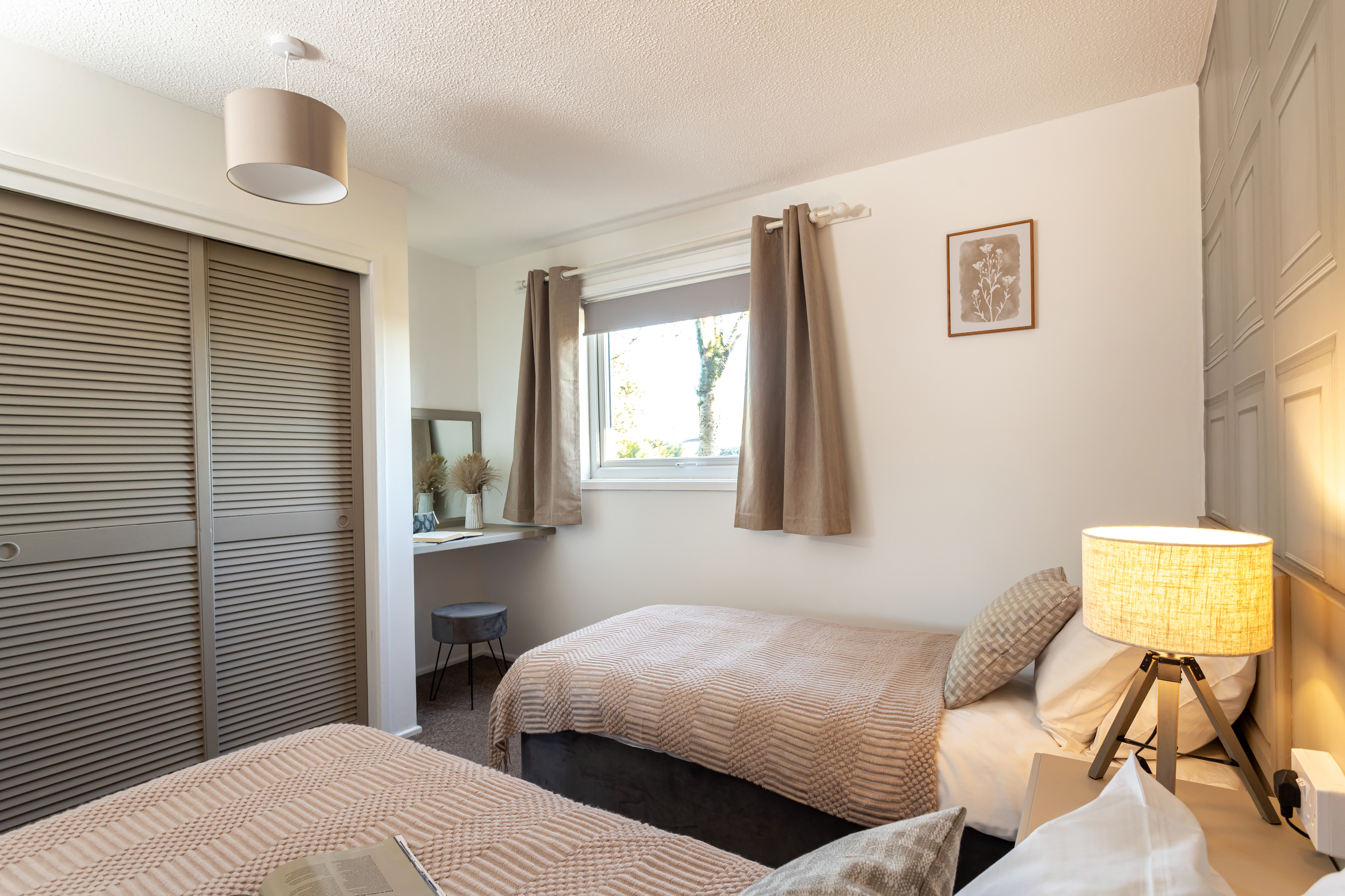 2 Single beds, fitted wardrobes, blackout curtains, a wall mounted 32" smart TV and Alexa controlled WiFi electric heaters.